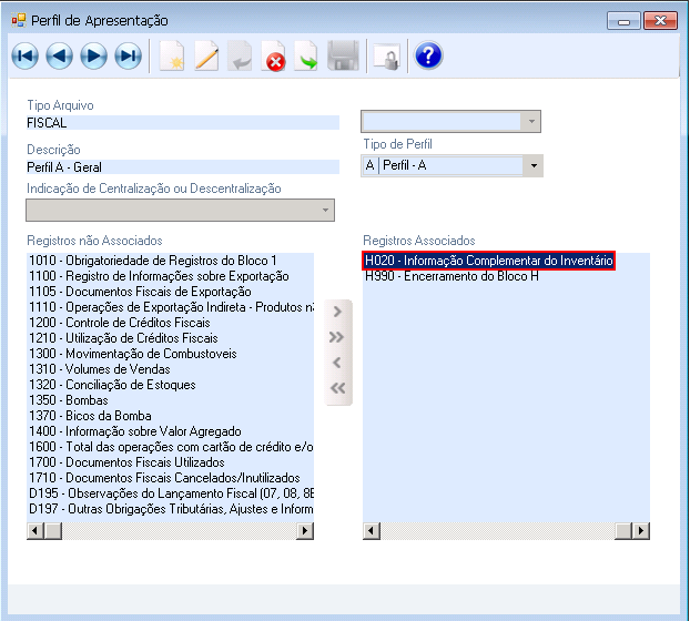 É necessário também associar o registro H020 no Perfil de Apresentação utilizado na geração do arquivo, conforme ilustrado abaixo: