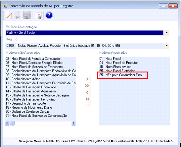Inclusão do modelo '60 - Cupom Fiscal Eletrônico ECF' aos registros C400, C405, C420, C460, C465 e C490 e modelo '65 - NF-e para Consumidor Final' aos registros C100 e C190 na tela ‘Conversão de Modelo de NF por Registro’ para os Perfis Standard abaixo. Alterações de acordo com o Guia Prático 2.0.12, com vigência a partir de Março/2013.