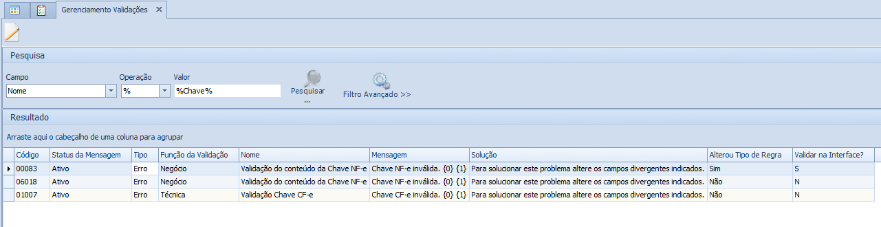 Melhoria realizada na tela Gerenciamento Validações, excluindo as seguintes validações: 00022 (Validação da Chave NFE) e 00034 (Validação da Chave NF-e para Modelo de Documento), sendo estas substituídas pela validação 00083 (Validação do Conteúdo da Chave NFE), e a validação 06019 (Validação da Chave NF3e para Modelo de Documento) substituída pela 06018 (Validação do conteúdo da Chave NF3e).