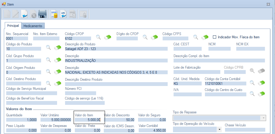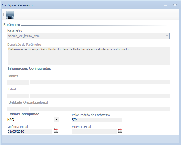 Se campo "Valor Configurado" igual a "Não" do parâmetro "calcula_vlr_bruto_item", será possível informar manualmente o campo "Valor do Item" (valor bruto do item).