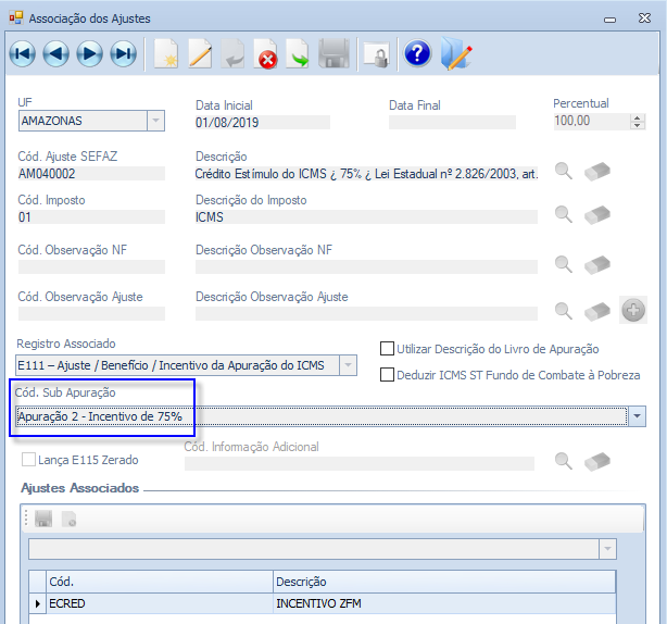 Caso o campo “Cód. Sub Apuração” da tela “Associação dos Ajustes” esteja vazio, serão considerados os lançamentos de ajustes, cujo campo “Indicador de Apuração” seja igual a 0 – Apuração Normal ou esteja vazio.