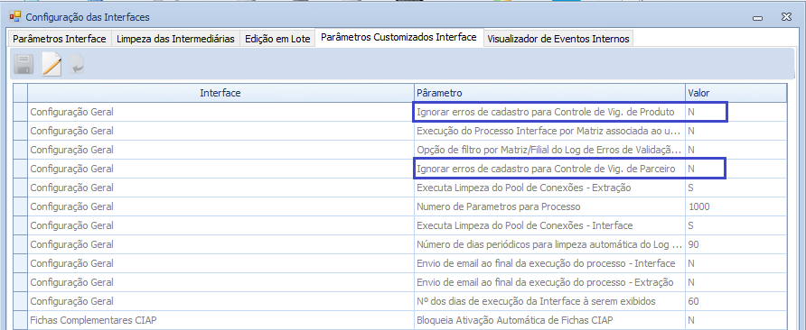 Em virtude desta liberação os registros podem parar no log de validações se os campos não estiverem corretamente preenchidos. Para a interface de Controle de vigência e de Produto, como ponto de melhoria, criamos parâmetros que permitirão tornar opcional a validação dos campos.