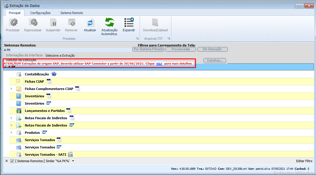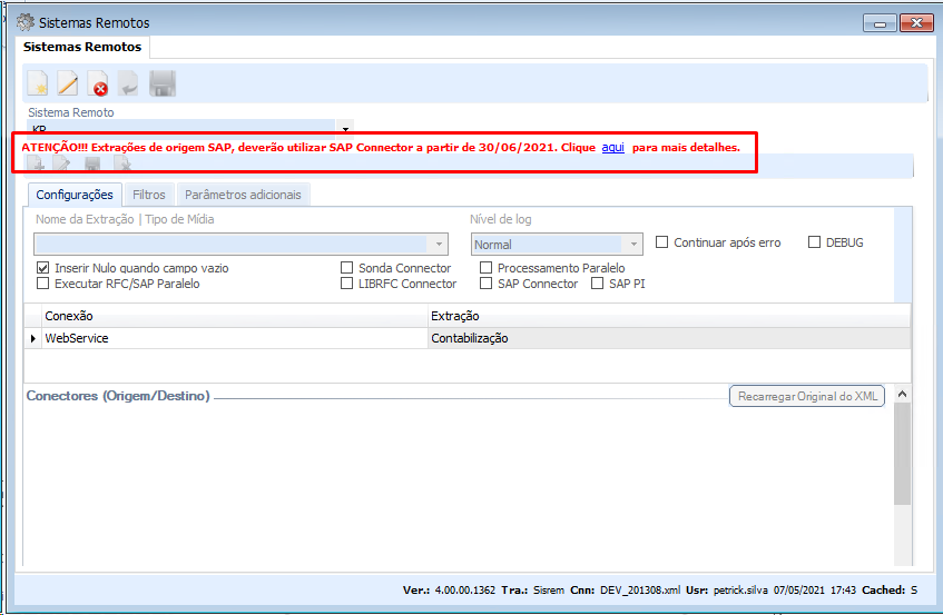 Componente Execução Extração de Dados: Prosseguindo com os nossos alertas sobre a futura obrigatoriedade de instalação do SAP Connector, para as Extrações de Dados com origem RFC, com data limite prevista para 30/06/2021, foi incluído um link de uma notícia criada no Portal de Produtos da Sonda sobre essa atualização, com o intuito de melhor explicar desde quando foi vista a necessidade dessa alteração, além de dar maiores detalhes sobre a instalação do SAP Connector. Esse link está disponível tanto na tela de Sistema Remoto quanto na tela de Execução da Extração de Dados, conforme demonstrado nos prints a seguir: