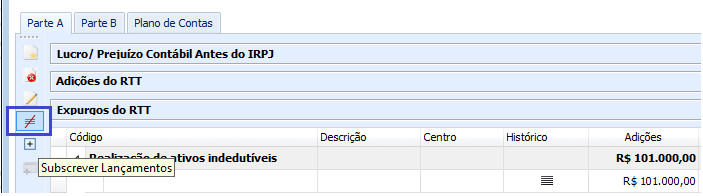 Para subscrever os lançamentos da Parte A do LALUR/LACS vinculados a uma conta contábil, que foram posteriormente alterados através da seleção de lançamentos contábeis, para que retornem aos valores originais de seus saldos contábeis, foi criado o botão Subscrever na barra lateral da tela.