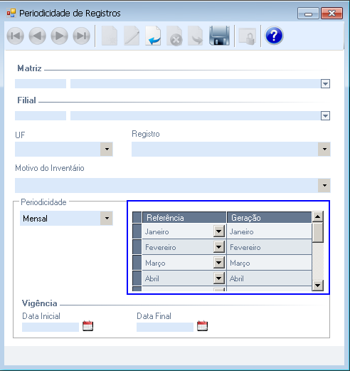 Desta forma, para cada mês de geração será possível configurar um mês de referência. Este tratamento foi necessário porque é permitido que o inventário seja escriturado até 60 dias contados da data do balanço, conforme § 7º do Art. 76 do Convênio S/N de 1970, independente da periodicidade do inventário.