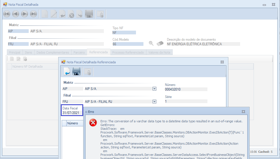 Ocorria o erro demonstrado abaixo ao utilizar o campo Data Fiscal como filtro de pesquisa da nota fiscal detalhada referenciada, em ambiente SQL.