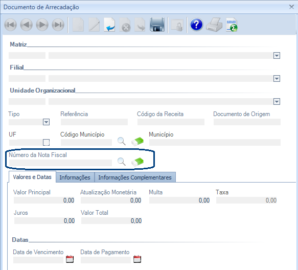 Descrição da Nota: Tratamentos: Inclusão do Número da Nota Fiscal na tela Documento de Arrecadação, para permitir o relacionamento com a Nota Fiscal. Possibilitar inclusão/edição na tela quando tipo de guia ICMS, com a associação do imposto 03 - ICMS ST. Alteração na contagem dos dias quando há feriados, para cálculo dos juros e multa da guia DARF, quando paga em atraso.