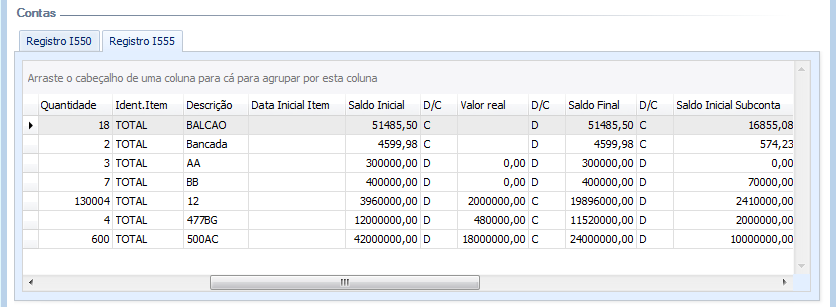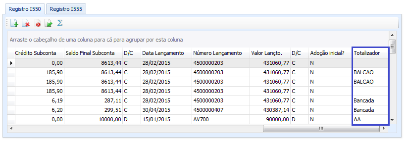 Após importação do arquivo.txt, o campo 4 - DESC_GRP_TOTAL_I555 poderá ser visualizado na tela, Aba “Registro I550” através do campo “Totalizador”.