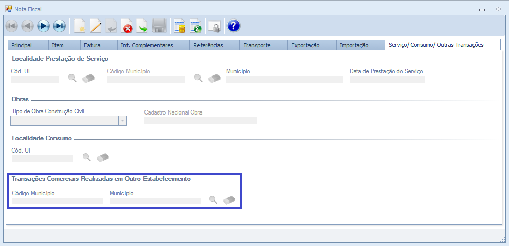 Tratamento para mudança do combo e na gravação do campo Município da área Transações Comerciais Realizadas em Outro Estabelecimento' na aba Serviço/Consumo/Outras Transações da funcionalidade.
