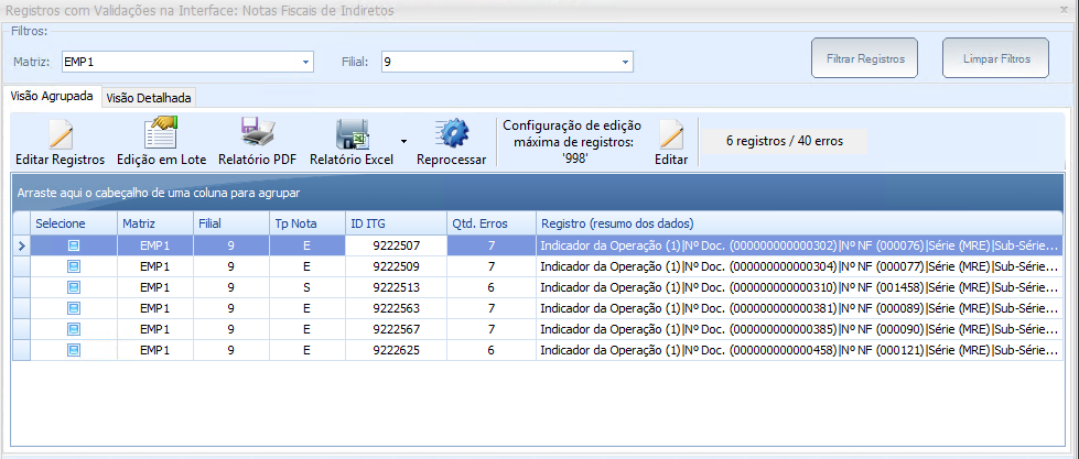 Melhoria realizada na tela de edição de registros com erros de validações nas Interfaces, com a inclusão de filtros de Matriz e Filial.