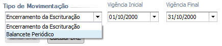 A tela Demonstração do Resultado do Exercício foi adaptada para permitir a criação de Balancetes Periódicos para obtenção do lucro mensal da empresa. Para isto, foi criado o campo Tipo de Movimentação, onde o usuário informa se deseja criar uma DRE de Encerramento da Escrituração ou um Balancete Periódico.