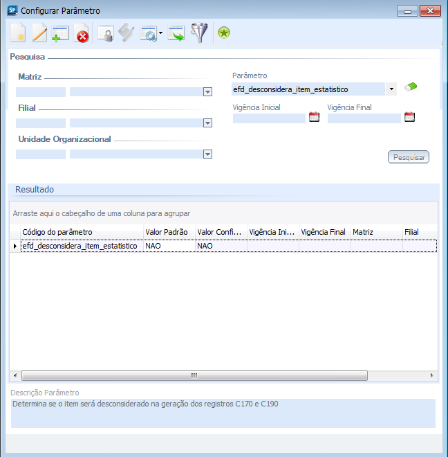 Esse parâmetro determina se os itens estatísticos serão desconsiderados na geração dos registros C170 e C190. Para que o item seja desconsiderado, o valor configurável deve ser preenchido como SIM. O valor padrão será disponibilizado como NÃO.