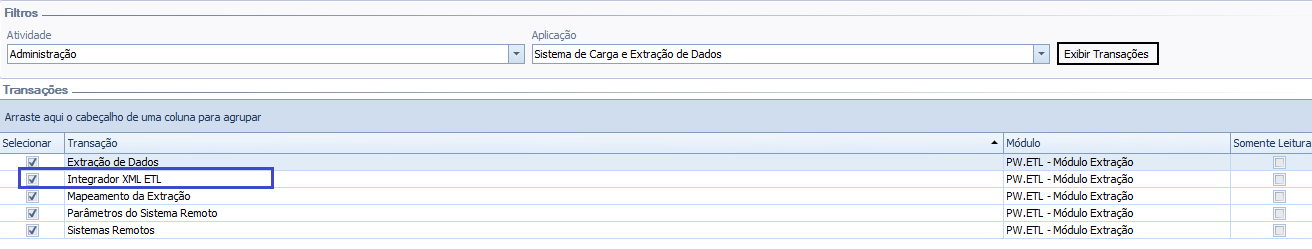 Selecionar a transação Integrador XML ETL e salvar através da opção "Aplicar alterações"