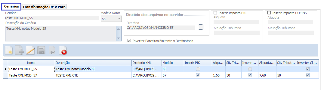 Aba Cenários, deve ser utilizada para o cadastramento dos cenários, neles devem ser definidos os parâmetros para a Leitura dos XML, como diretório de Origem, o modelo do documento que será carregado, se para o cenário as informações de Emitente e Destinatário da nota deve ser invertida e se deseja realizar inserção adicional de impostos PIS e COFINS, com suas parametrizações. Podem ser cadastrados mais de um cenário por modelo.