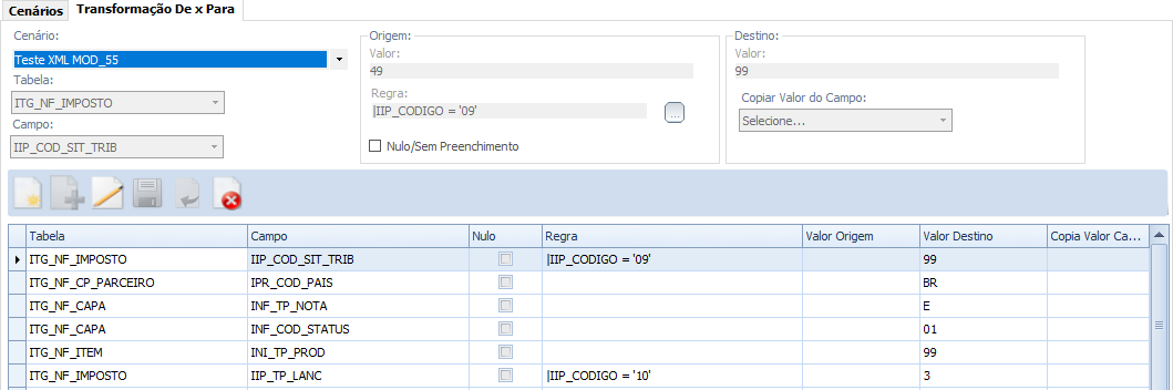 Na Aba "Transformação De x Para", podem ser cadastradas as transformações desejadas: