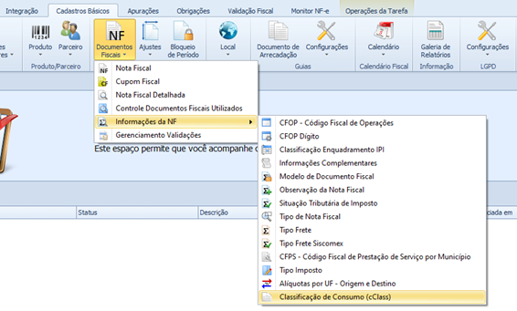 Cadastros Básicos > Documentos Fiscais > Informações da NF> Classificação de Consumo (cClass).