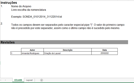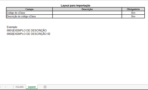Essa tela disponibiliza um arquivo leiaute com duas abas, a primeira contendo as instruções de como o arquivo deve ser preparado para efetuar a importação e, a segunda com um exemplo a ser seguido, conforme ilustrado abaixo: