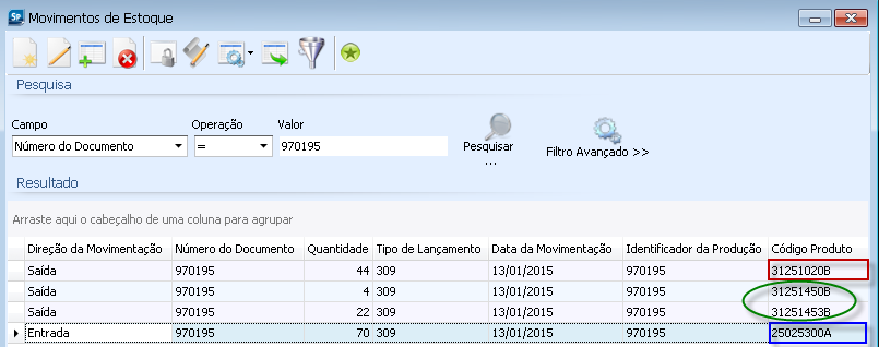 Para o cenário em que diversos códigos de origem (Direção do Movimento: Saída) estão relacionados com um código de destino (Direção do Movimento: Entrada) era gerado apenas um registro K220, ou seja, uma linha informando o código de destino e apenas o primeiro código de origem do lançamento. Os demais códigos de origem não eram exibidos, conforme exemplo abaixo: