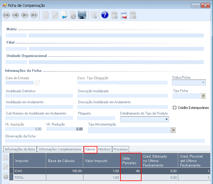 Segue destacado o campo 'Qtde. Parcelas' que será utilizado para identificar o número total de parcelas a serem apropriadas, segundo a legislação de cada unidade federada: