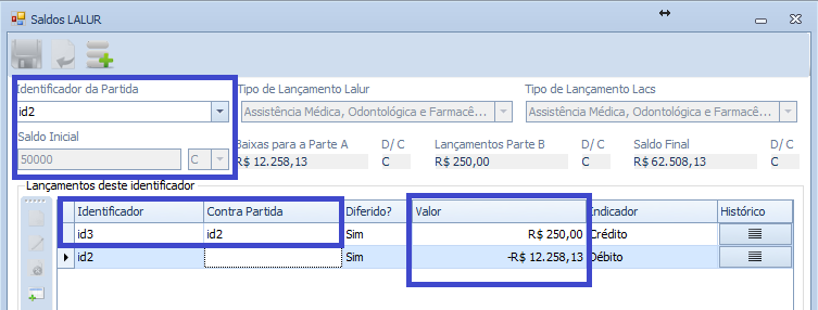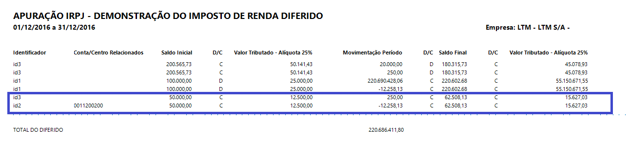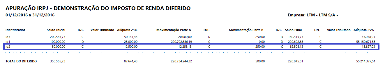 A apuração do demonstrativo IRPJ ou CSLL, apresenta o relatório aberto por lançamentos, confome a tela de "Saldos Lalur" (Clicar duas vezes sobre o identificador da parte B, na tela LALUR/LACS), onde é possível visualizar toda a movimentação do período para o identificador selecionado: