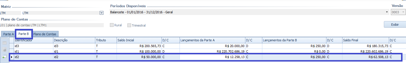 A apuração do encerramento (Oficial) IRPJ ou CSLL, apresenta o relatório de forma resumida, confome dados na aba "Parte B" tela LALUR/LACS, onde é possível visualizar os dados de forma sucinta para o identificador selecionado:
