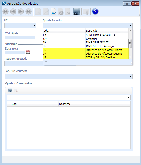 Descrição da Nota: Inclusão dos impostos "J6', "J7" e "J8" no combo "Tipo de Imposto" para atender ao Ato COTEPE nº 44/2015.