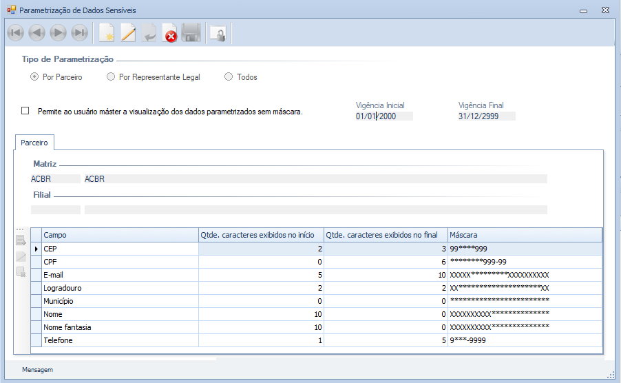 Será necessário, parametrizar as máscaras dos dados sensíveis na Tela "Dados Sensíveis/Aba Parceiro".