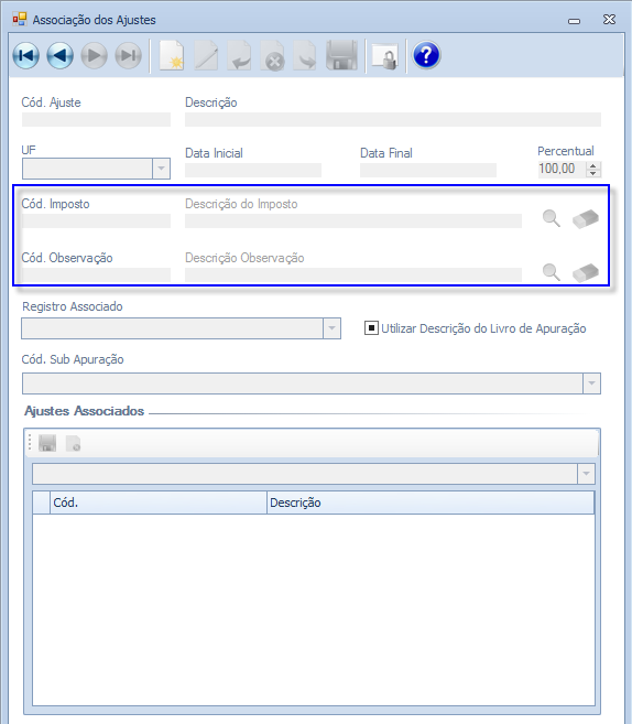 Descrição da Nota: Tratamento realizado na tela "Associação dos Ajustes" para que seja possível incluir um novo registro sem a informação do campo "Código Observação". Melhoria nos campos "Cód. Imposto" e "Cód. Observação" para facilitar a pesquisa dos dados.