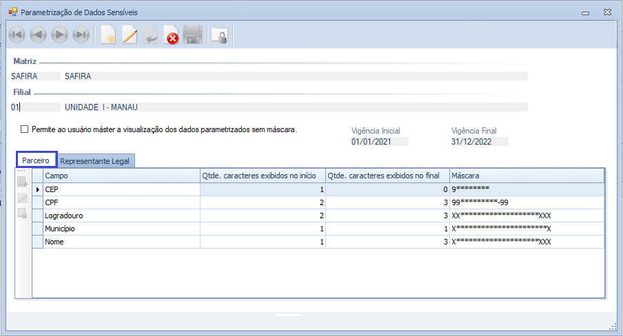 Será necessário, parametrizar as máscaras dos dados sensíveis na Tela "Dados Sensíveis/Aba Parceiro".