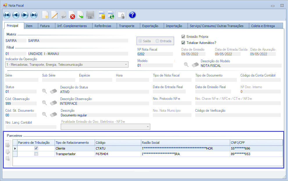Descrição da Nota: Tratamento realizado nas abas "Parceiro" e "Coleta/Entrega" da Tela Nota Fiscal para possibilitar a visualização através de máscaras dos dados sensíveis do parceiro (pessoa física), em atendimento à Lei de Proteção dos Dados Pessoais, nº 13.709 - LGPD.