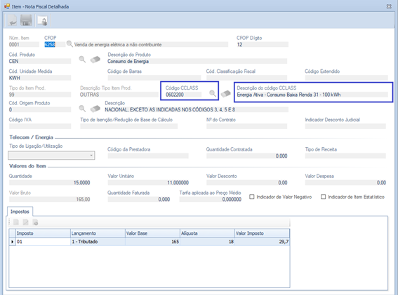 Melhoria na tela ‘Nota Fiscal Detalhada’ com a inclusão dos campos ‘Código CCLASS’ e ‘Descrição do Código CCLASS’, passando a ser demonstrado os Códigos de Classificação conforme Tabela de Classificação de Item de Energia Elétrica.