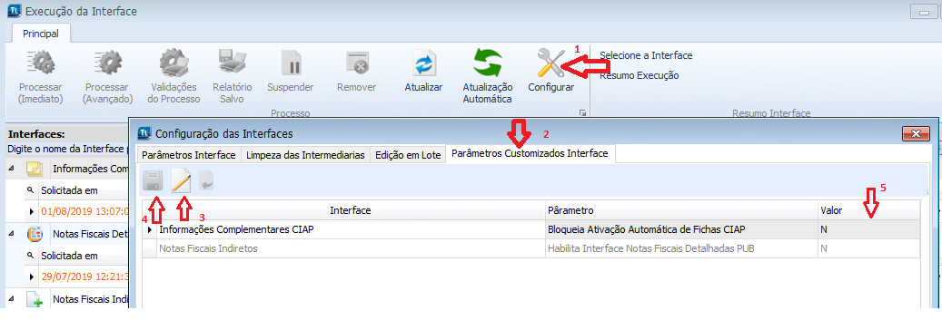 O acesso a tela deve ser realizado através da Tela “Execução da Interface”, Botão: “Configurar” (1), Aba: “Parâmetros Customizados Interface” (2).