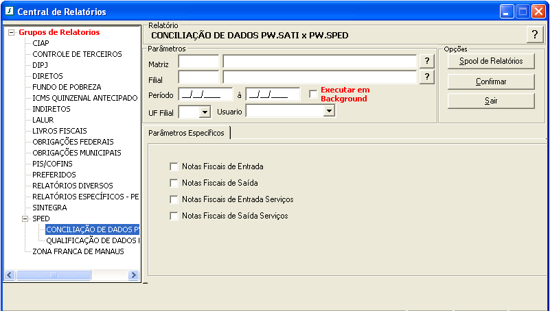 Descrição da Nota: Desenvolvimento do relatório de CONCILIAÇÃO DE DADOS PW.SATI x PW.SPED para as origens de Notas Fiscais de Entrada e Saída e Notas Fiscais de Entrada Serviços e Saída Serviços.