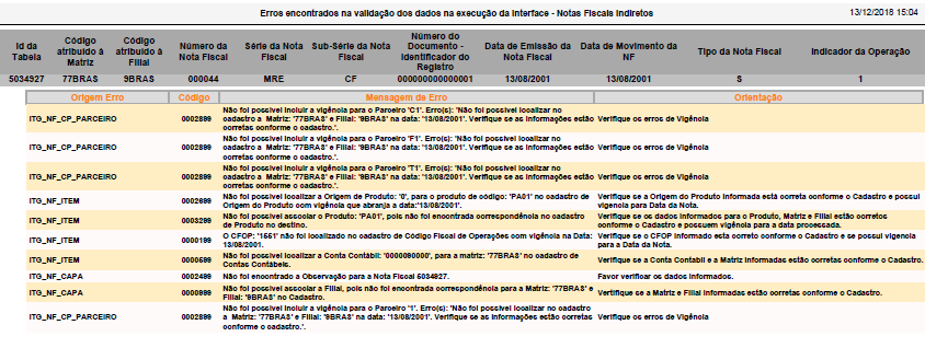 Log de Validações com a funcionalidade ativa (como ouve falha ao encontrar a Filial, as demais validações não foram executadas):