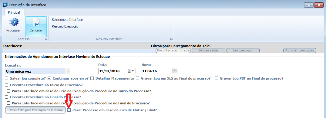 Para utilizar o recurso disponibilizado por esta funcionalidade, ao iniciar uma nova tarefa de interface, deverá ser utilizado o “Processar (Avançado)” marcando o parâmetro “Para Processo em caso de Erro de Matriz / Filial”.