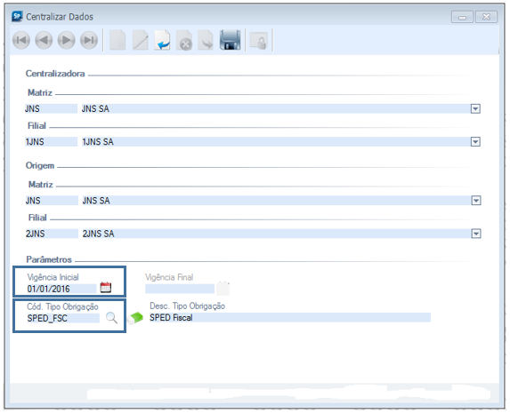 Em parâmetros informe a Vigência Inicial é o Cód. Tipo Obrigação para Sped Fiscal é SPED_FSC.