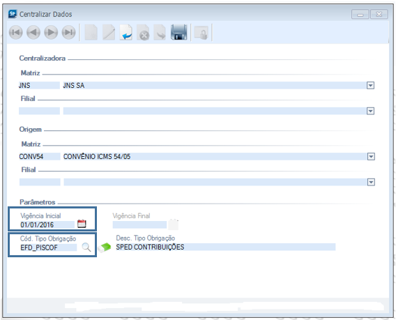 Em parâmetros informe a Vigência Inicial é o Cód. Tipo Obrigação para Sped Contribuições é EFD_PISCOF.