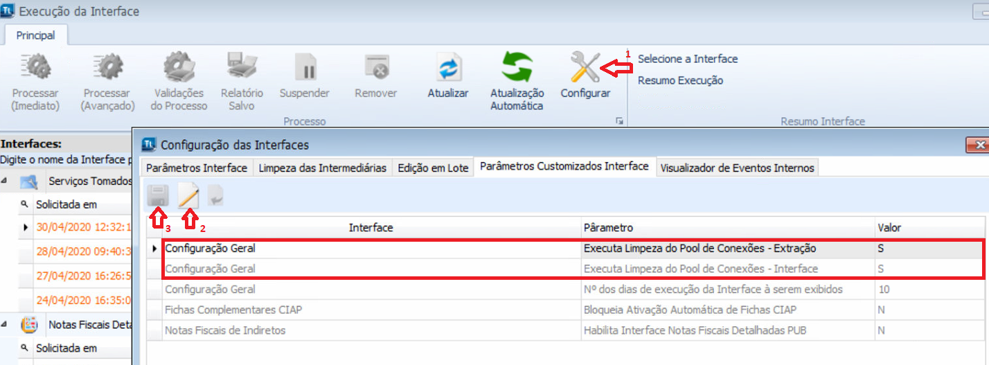 Foram criados parâmetros que permitem a definição da chamada da rotina de limpeza do pool de conexões pelos processos de Extração e Interface. O valor padrão ‘S’ permite que estes processos controlem a funcionalidade pra realizar a Limpeza de Pool conexões, alterando o valor para ‘N’, a funcionalidade não será acionada pelos processos. O acesso a tela que permite o ajuste deste parâmetro, é realizado através do botão “Configurar” *1 disponível através da tela de Execução de interface, na Aba “ Parâmetros Customizados Interface” clicar no botão “Editar” *2, ajustar o valor do parâmetro referente ao processo desejado e depois clicar em “Salvar” *3.