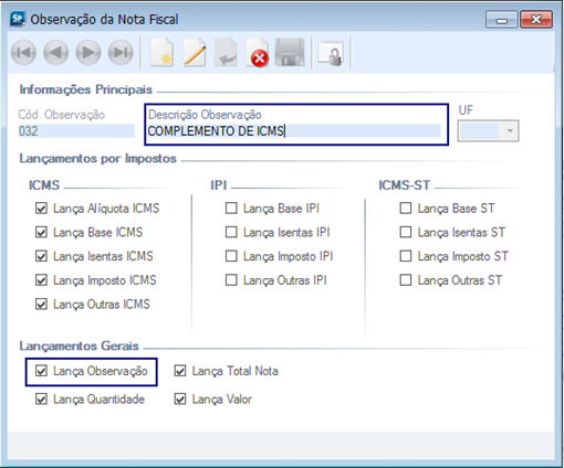 Importante: É necessário que o campo “Lança Observação” esteja selecionado.