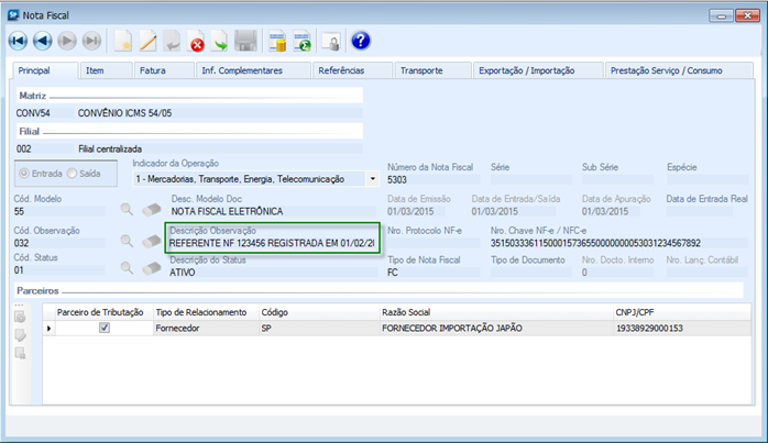 Para atender ao artigo 155, inciso VI, letra “b” do RICMS - RS, sobre a apresentação das notas fiscais emitidas referentes à venda fora do estabelecimento, foi realizado tratamento no campo “03 – TXT” do registro 0460 para que seja concatenada a descrição do código de observação das telas ‘Observação da Nota Fiscal’ e ‘Nota Fiscal’, conforme ilustrado abaixo: