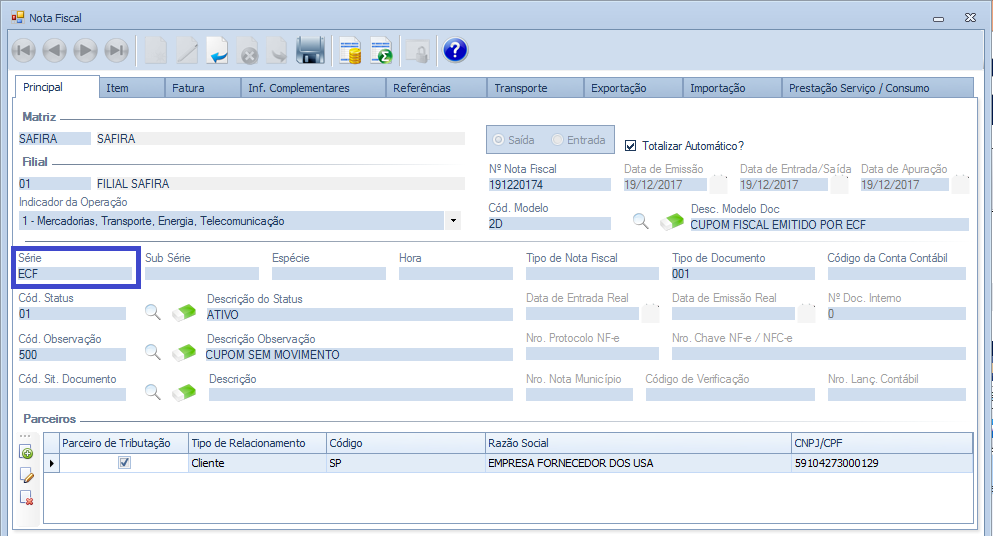 Como a Observação é diferente de 022 e 032 e a Série diferente de ECF, CMR e SAT, o campo Total da Nota Fiscal é obrigatório e deve ser maior que 0.