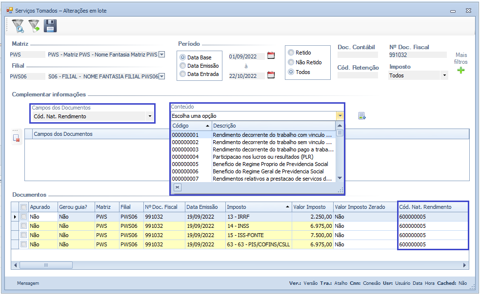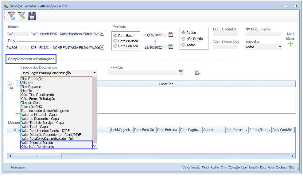 Descrição da Nota: Melhorias na tela de Serviços Tomados - Alterações em lote, com a inclusão dos campos Valor Imposto Zerado e Cód. Nat. Rendimento, na sessão Complementar Informações, em atendimento ao EFD-Reinf versão 2.1.1.