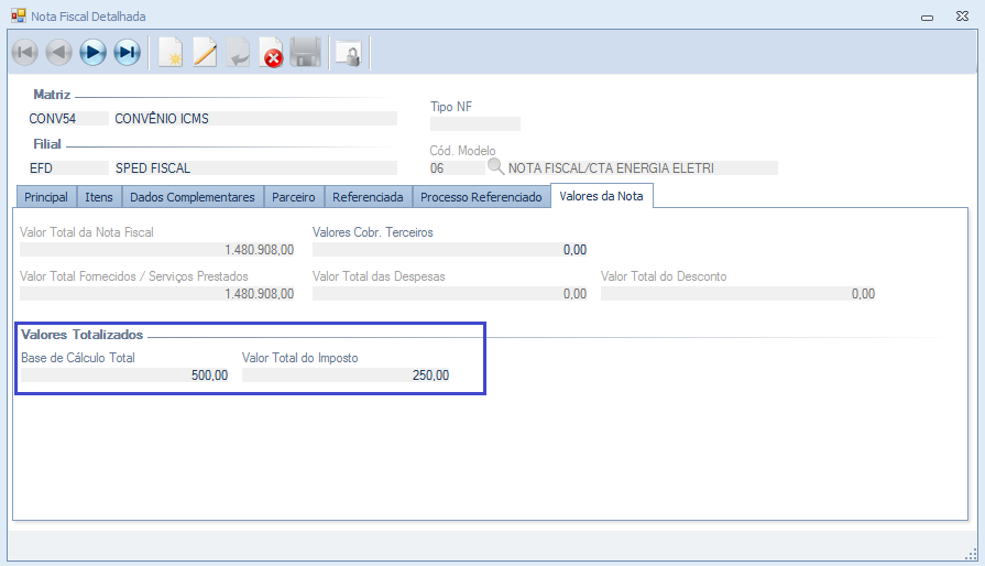 1. Tratamento para disponibilizar os campos 'Base de Cálculo Total' e 'Valor Total do Imposto' na aba Valores da Nota.