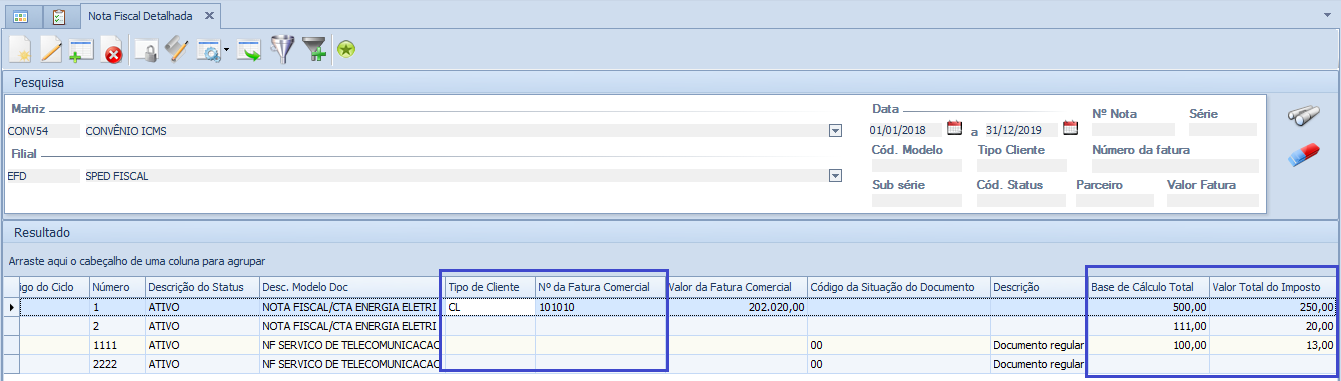 3. Tratamento para disponibilizar os campos 'Base de Cálculo Total', 'Valor Total do Imposto', 'Tipo de Cliente', 'Número da Fatura Comercial' e 'Valor da Fatura Comercial' no grid de pesquisa da funcionalidade.