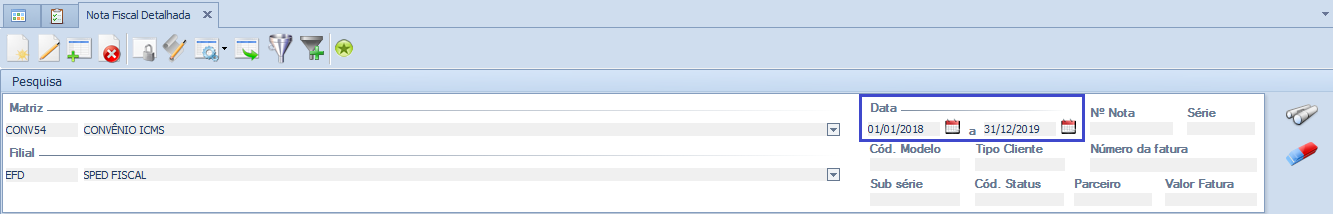 Descrição da Nota: Tratamento na pesquisa por período da funcionalidade, nas abas Valores da Nota, Itens, Parceiro e Dados Complementares e adição de novos campos no grid de pesquisa.