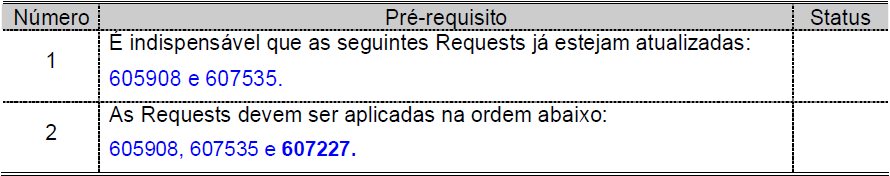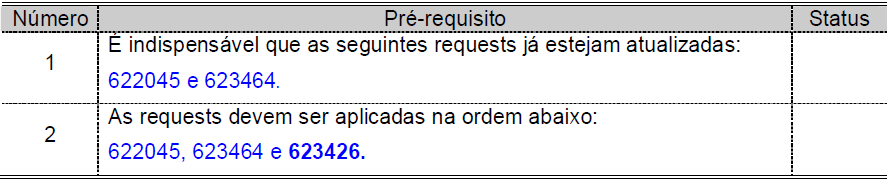 1 | É indispensável que as seguintes Requests já estejam atualizadas: 640633 e 640937. |