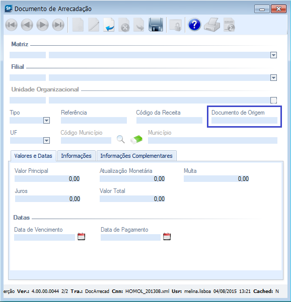 Descrição da Nota: Inclusão do campo Documento de Origem na tela de Documento de Arrecadação.