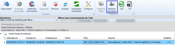 Acesse no Menu de Extração de Interfaces e conheça o Relatório. Ao clicar no botão Relatório Agrupado, os erros de validação ocorridos no processo poderão ser exportados somente na extensão .xlsx do Excel: