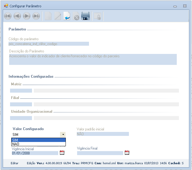 Menu: Configurar > Parâmetros > Configuração de Parâmetros.