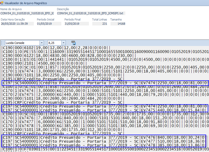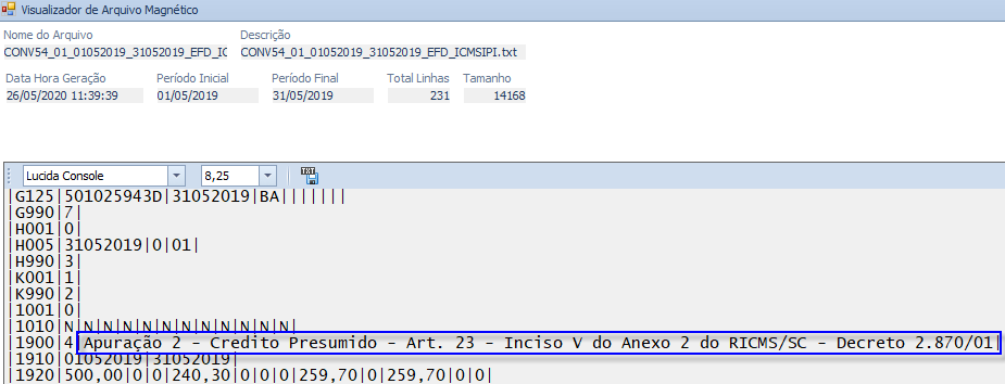 Descrição da Nota: Alteração nos registros 1900 e 1920 para atender à Portaria 377/2019 - SC. Tratados alguns campos dos registros 1960, 1970, 1975 e 1980 para considerar o Vl. Contábil ao invés do Vl. Bruto do Item. Tratado o registro 1400 para considerar apenas as operações tributadas ao calcular da diferença entre o Vl. Total e a Base de Cálculo de algumas situações. Tratado o registro C185 para selecionar as Notas Fiscais de Saída identificadas no Relatório das Informações Complementares do ICMS ST.